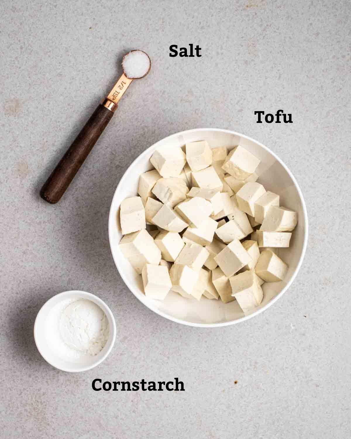- Add tofu, cornstarch, and salt into a container. Place the lid on and toss to coat.1 block extra-firm/ firm tofu, 1 tablespoon cornstarch, ½ teaspoon salt